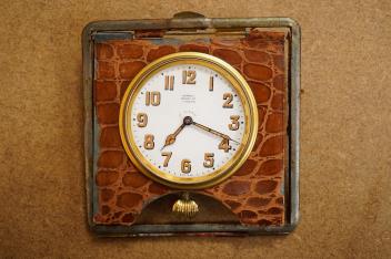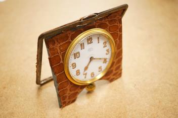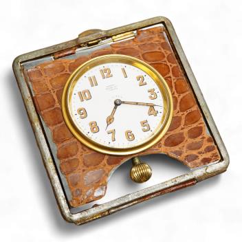 Lot 1398 , An Asprey crocodile inset travelling 8 day timepiece 10 cm high.