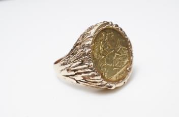An Edward VII half sovereign coin ring, 1909 and later, the half sovereign collet-set in a later textured gold ring mount, size V, stamped 9CT, gross weight approximately 17 grams
