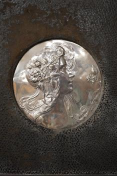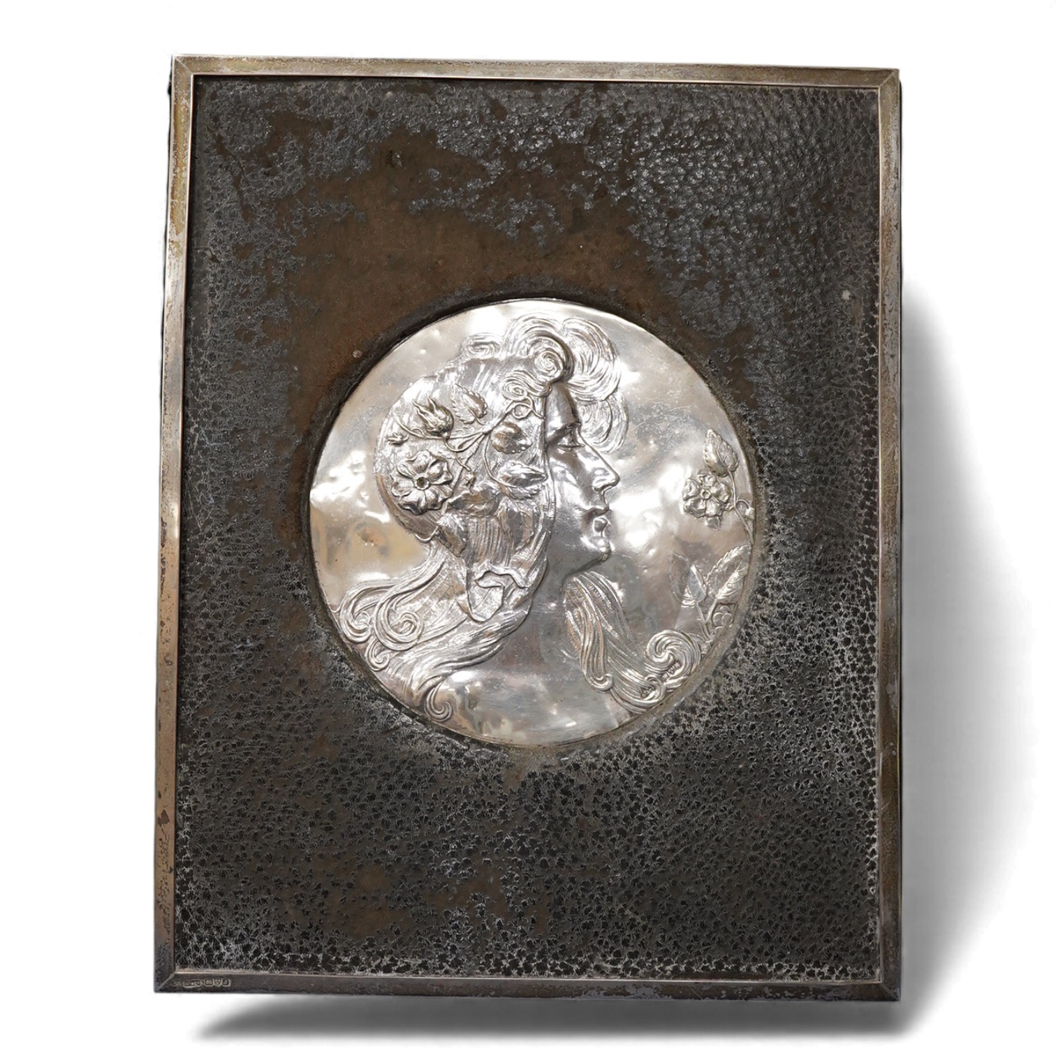 Lot 828 , An Edwardian Art Nouveau silver mounted blotter, decorated wit the bust of a young lady, Grey & Co, Chester, 1909, 31.4cm.