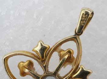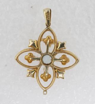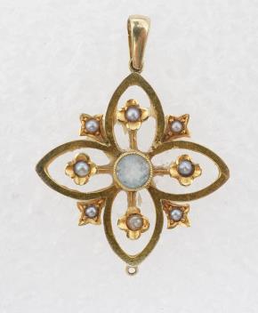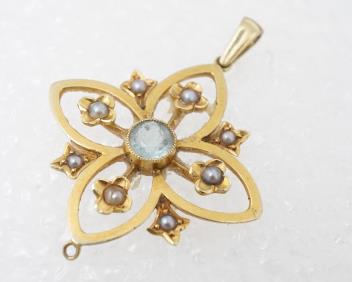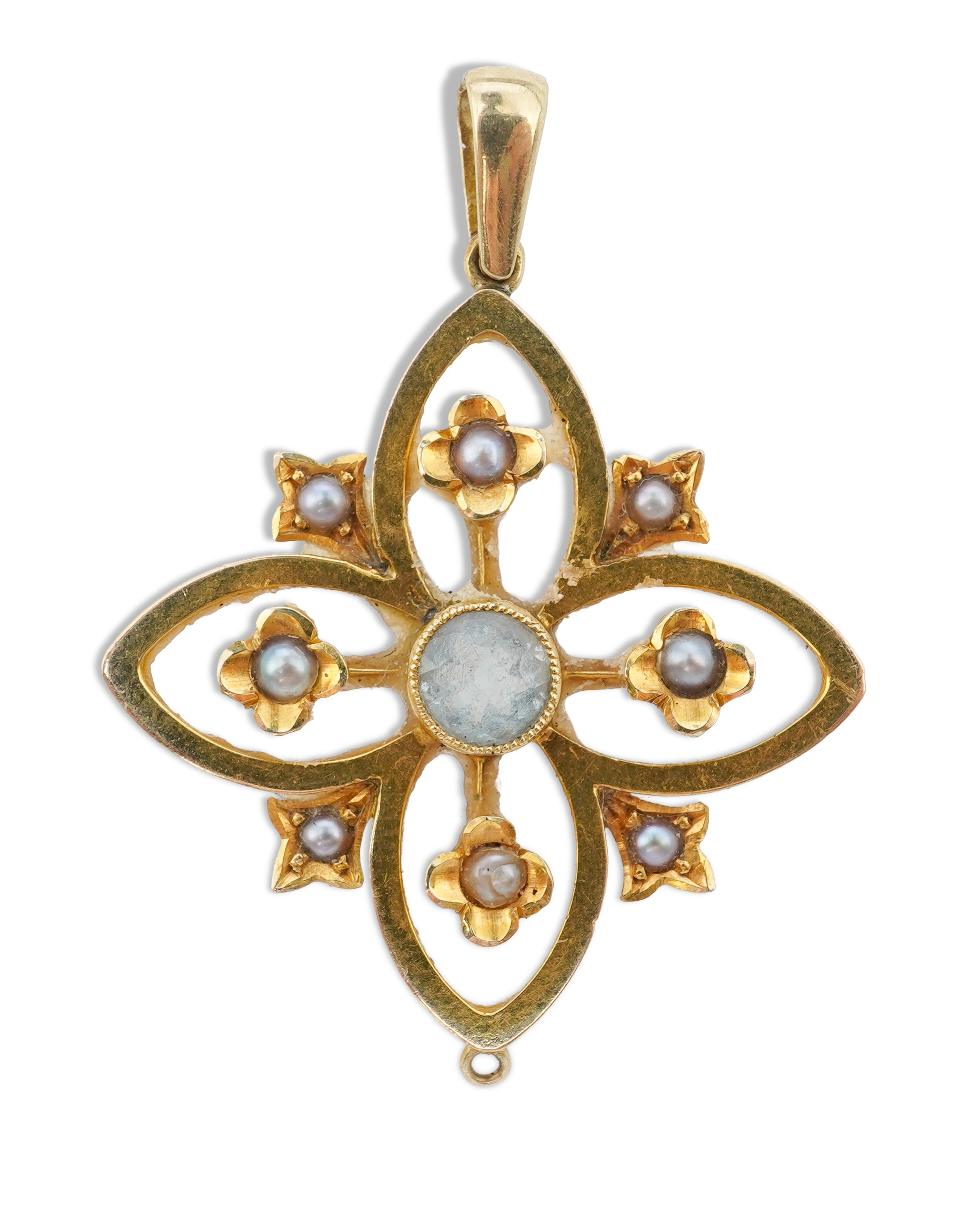 An Edwardian Gothic Revival aquamarine and seed pearl pendant, early 20th century, of quatrefoil design, centring on a circular-cut aquamarine, decorated with foliate motifs set with seed pearls, the base with a small hoop intended for a pendant, mounted in gold, length 3.3cm including bail, stamped 15CT, gross weight approximately 2.5 grams
