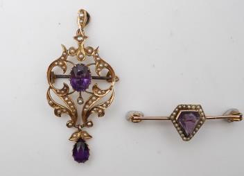 An Edwardian amethyst and seed pearl pendant and bar brooch, early 20th century, comprising: a foliate brooch set with an oval amethyst and seed pearls, suspending a pear-shaped amethyst drop, mounted in gold, length 5.5cm, gross weight approximately 5.5 grams; and a bar brooch set with a shield-shaped amethyst within a border of seed pearls, mounted in gold, length 3.8cm, gross weight approximately 2.0 grams, case, pearls untested