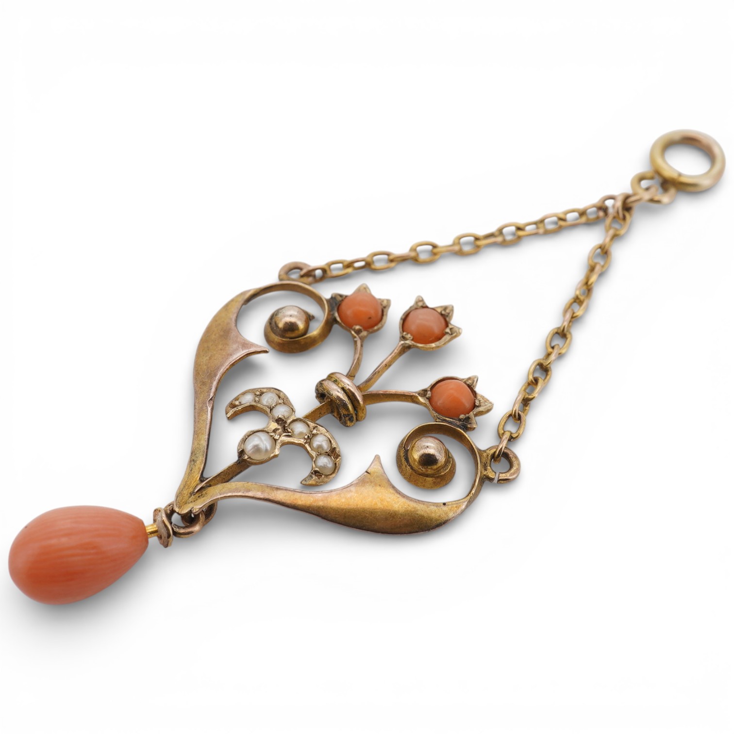 An Edwardian coral and seed pearl pendant, early 20th century, of foliate design in gold, set with coral cabochons and seed pearls, and suspending a coral pendant, length 5.4cm, stamped 9CT, gross weight approximately 2 grams