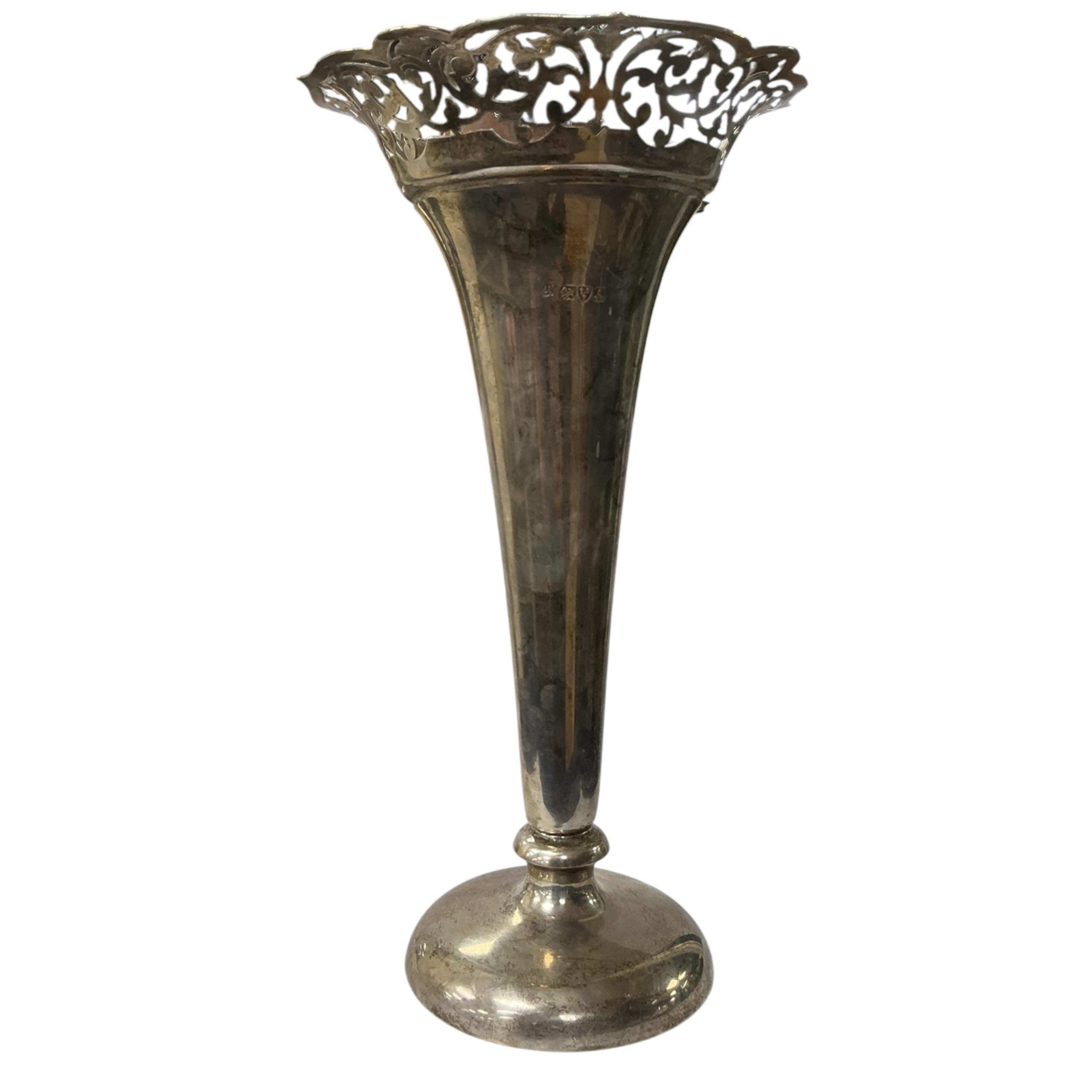 An Edwardian large silver mounted trumpet vase, with pierced border, James Deakin & Sons, Chester, 1901, height 30.8cm, weighted.