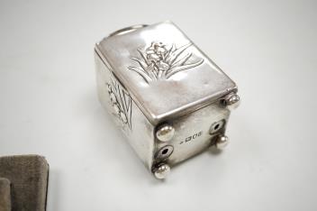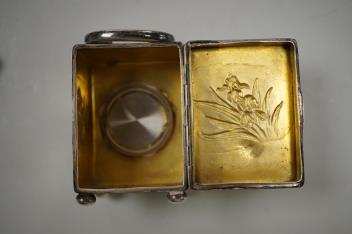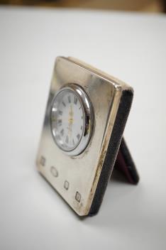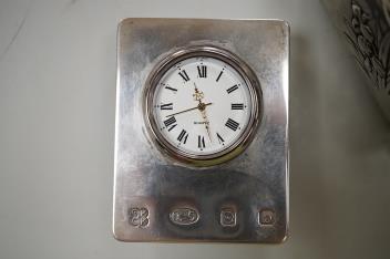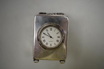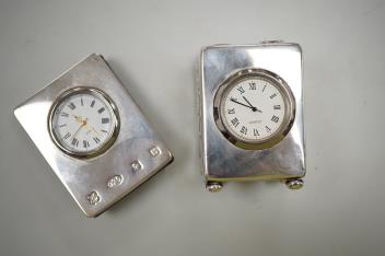 Lot 837 , An Edwardian miniature silver carriage timepiece by William Comyns, London, 1909, 65m with replacement quartz movement, together with a modern silver mounted desk timepiece.