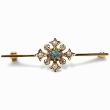 Lot 1913 , An Edwardian opal triplet, seed pearl and diamond bar brooch, early 20th century and later, of foliate design, centring on a claw-set oval opal triplet, within a foliate border set with split seed pearls and cushion-shap