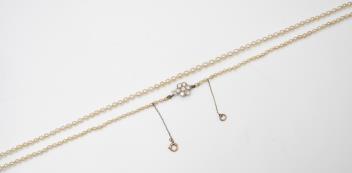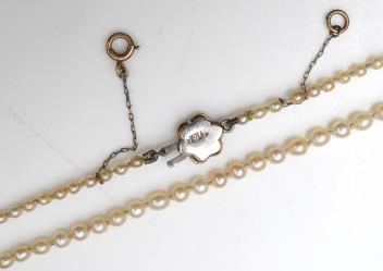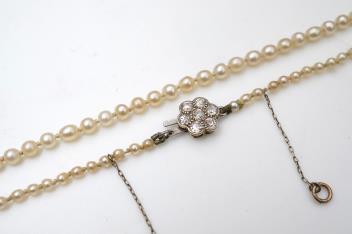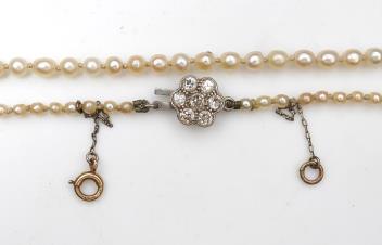 An Edwardian pearl and diamond necklace, early 20th century, composed of pearls measuring approximately 2-3mm, to a clasp of floral design set with circular-cut diamonds totalling approximately 0.35 carats, length 46cm, clasp stamped 18CT, pearls untested