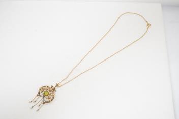 Lot 1131 , An Edwardian seed pearl and peridot pendant, early 20th century, of foliate design, set with seed pearls and a circular-cut peridot, mounted in gold, to a gold chain, each stamped 15CT, pendant length 5.5cm, chain length