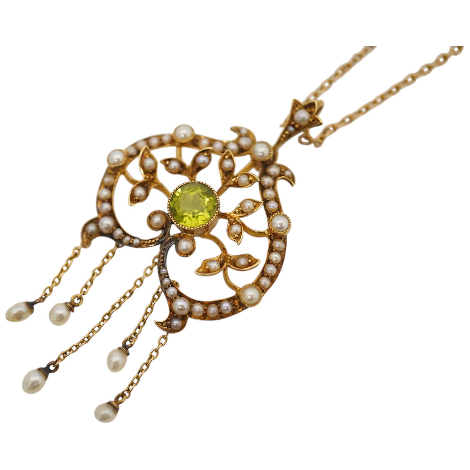An Edwardian seed pearl and peridot pendant, early 20th century, of foliate design, set with seed pearls and a circular-cut peridot, mounted in gold, to a gold chain, each stamped 15CT, pendant length 5.5cm, chain length 42cm, combined gross weight approximately 7 grams