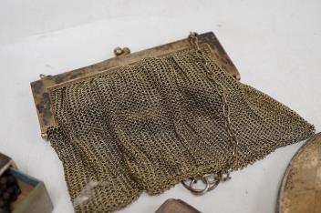 An Edwardian silver mesh evening bag, import marks for Birmingham, 1908, together with a silver heart shaped compact and two silver match sleeves.