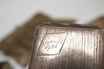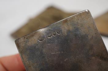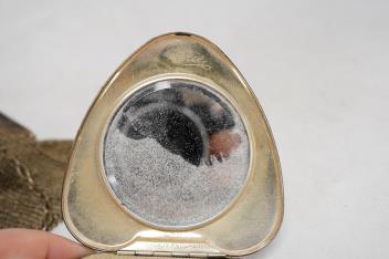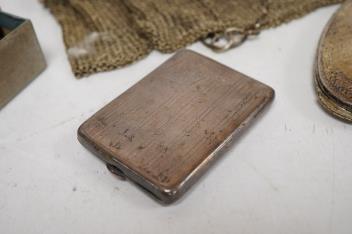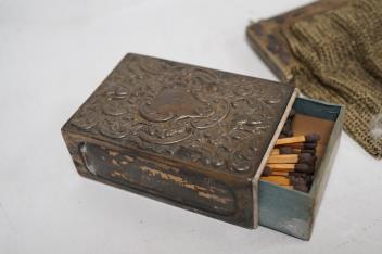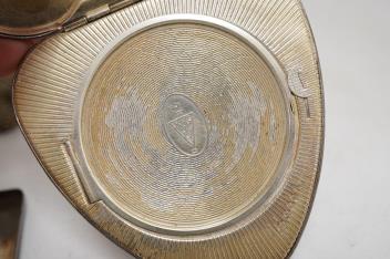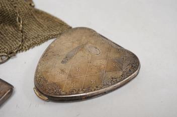 Lot 1827 , An Edwardian silver mesh evening bag, import marks for Birmingham, 1908, together with a silver heart shaped compact and two silver match sleeves.