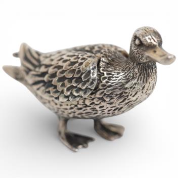 Lot 1009 , An Elizabeth II novelty silver box, modelled as a duck with hinged wings, by Lexi Dick, London, 1980, 46mm.