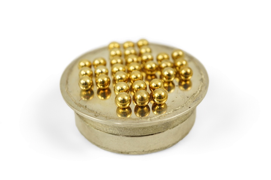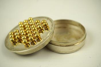 An Elizabeth II parcel gilt silver circular box and cover with game of solitaire, by Vera Mary Honeker, the cover with thirty two silver gilt pegs, London, 1980 diameter 50mm.