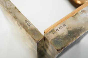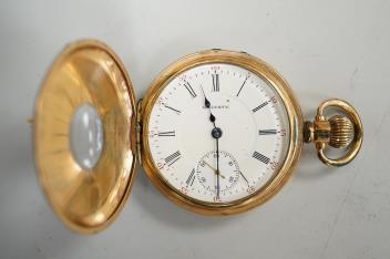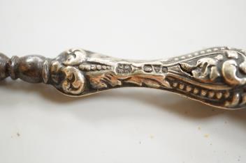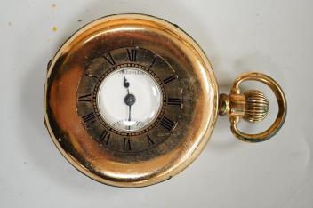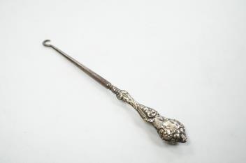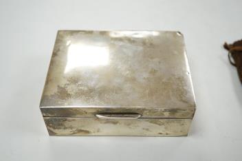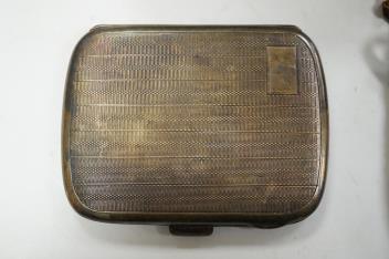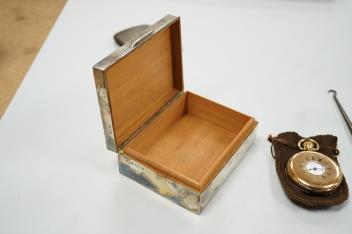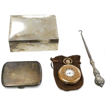 Lot 1840 , An Elizabeth II silver mounted cigarette box, Birmingham, 1957, 11cm, together with an earlier engine turned silver cigarette case, a silver handled button hook and a gold plated Waltham keyless half hunter pocket watch.