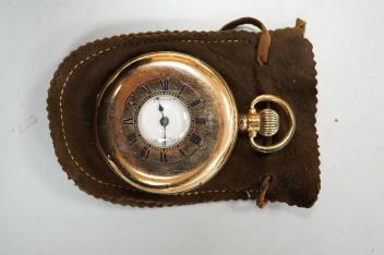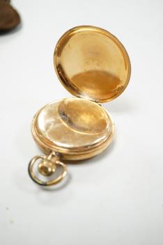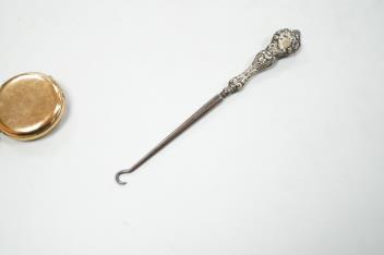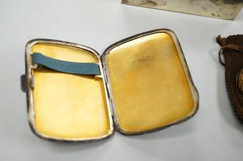 An Elizabeth II silver mounted cigarette box, Birmingham, 1957, 11cm, together with an earlier engine turned silver cigarette case, a silver handled button hook and a gold plated Waltham keyless half hunter pocket watch.