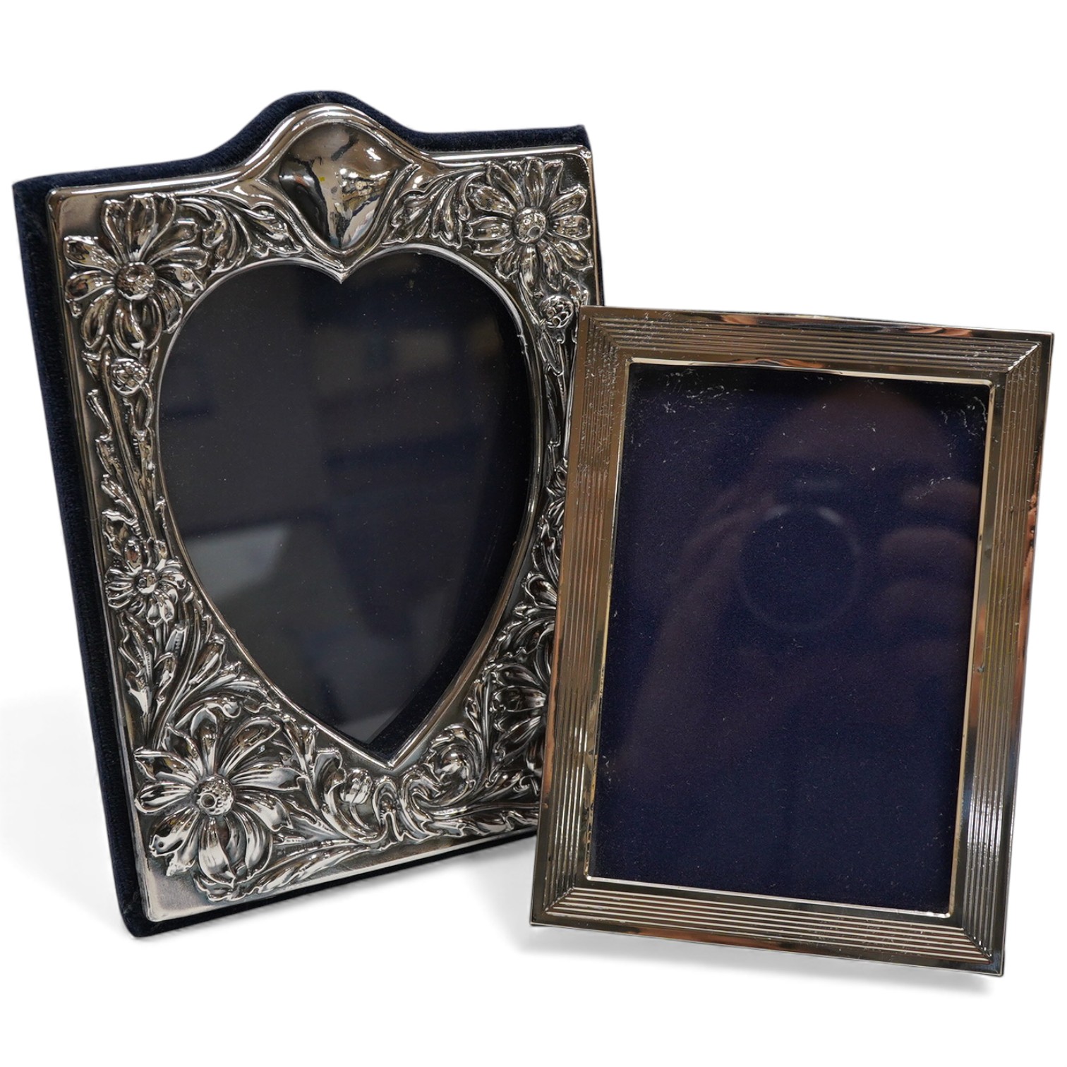 An Elizabeth II silver mounted photograph frame, with heart shaped aperture, Keyford Frames Ltd, Birmingham, 1992, 19cm by 14.4cm, together with an Italian 925 mounted rectangular photograph frame.