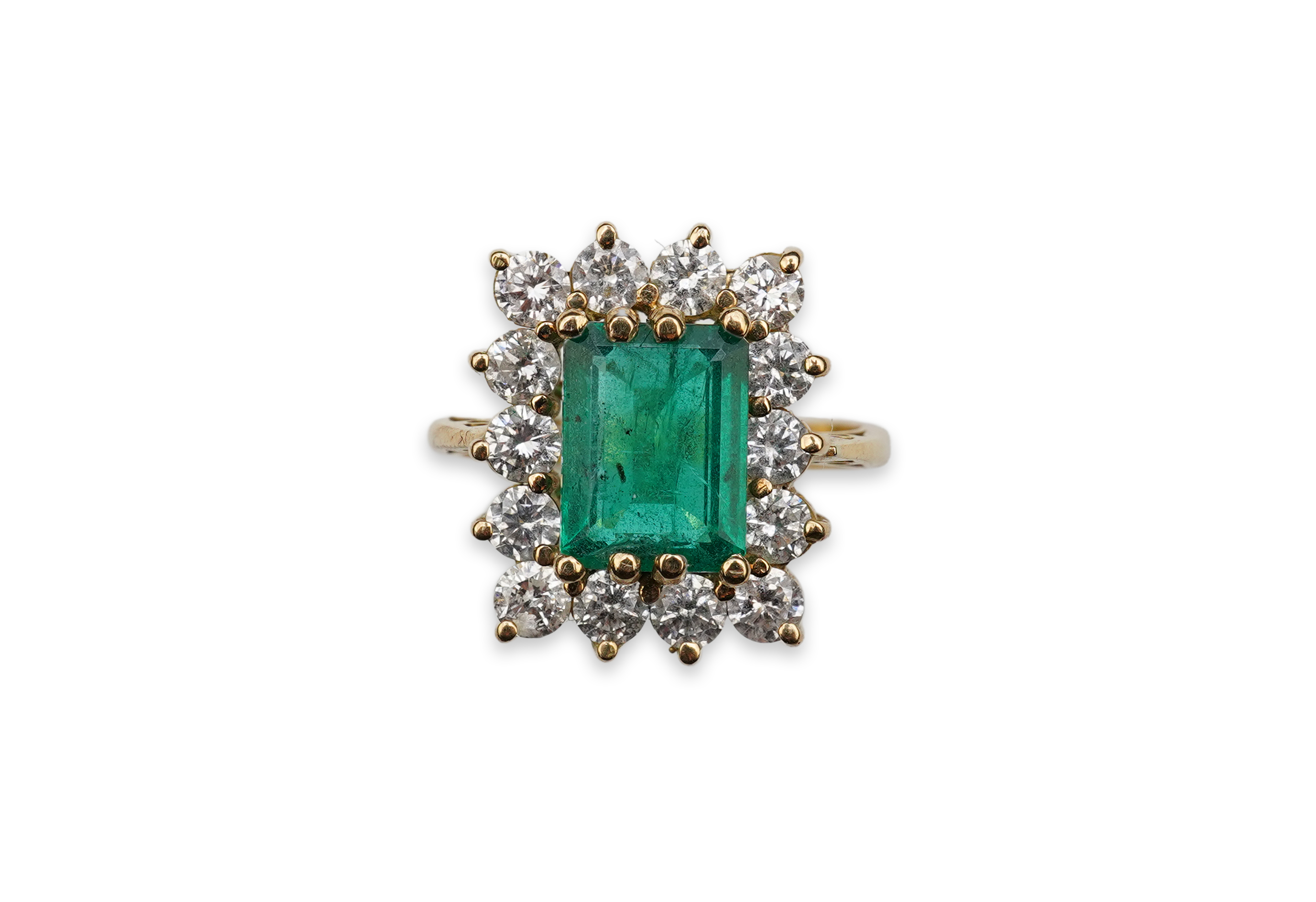 An Emerald and diamond ring, of cluster design, claw-set with an emerald weighing approximately 1.50 carats, within a border of brilliant-cut diamonds totalling approximately 1.20 carats, mounted in gold, size P1/2, gross weight approximately 6.5 grams