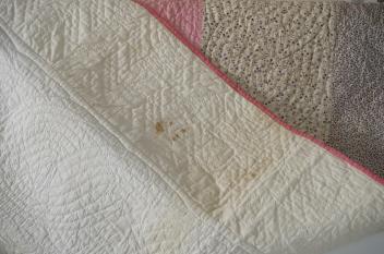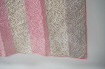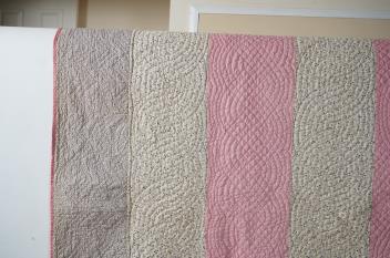 Lot 354 , An English 19th century, highly ornate hand quilted English bedcover. Designed using alternating stripes, in a plain pink and a small printed floral cotton, then finishing with two borders of a darker minute spot floral