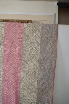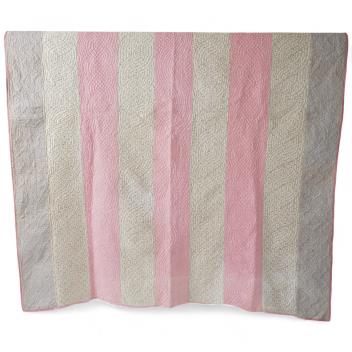 An English 19th century, highly ornate hand quilted English bedcover. Designed using alternating stripes, in a plain pink and a small printed floral cotton, then finishing with two borders of a darker minute spot floral cotton. Backed in a plain off white cotton. 244cm x 204cm. Condition - the cottons and quilt are strong, there is some very light fading on end from the sun, and a small mark to one edge. The back has a few marks, acceptable for age and use
