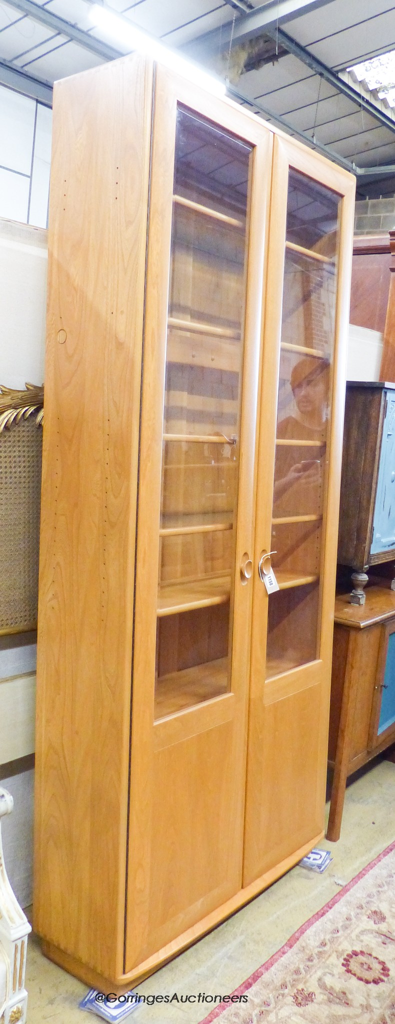An Ercol Windsor elm two door display cabinet, width 91cm, depth 32cm, height 206cm