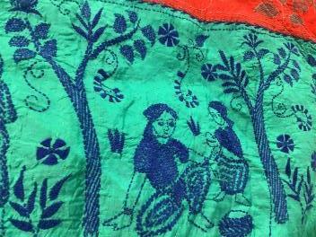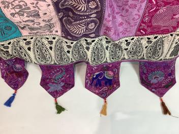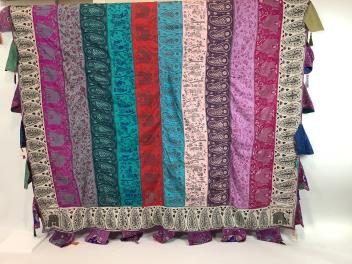 An Indian 20th century embroidered silk hanging, with decorative triangular tasselled edges. Worked in colourful silk stripes, with varying silk embroidered all over motifs. Bordered with colourful silk, beaded, tasselled and heavily embroidered shaped panels. Possibly a celebratory wedding hanging. 262cm x 232cm.