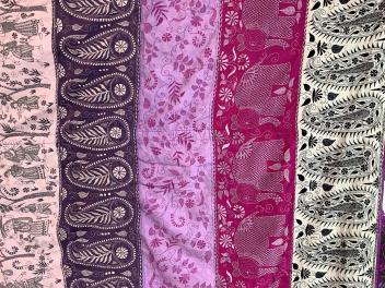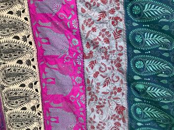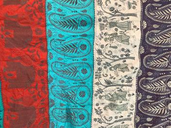 Lot 350 , An Indian 20th century embroidered silk hanging, with decorative triangular tasselled edges. Worked in colourful silk stripes, with varying silk embroidered all over motifs. Bordered with colourful silk, beaded, tasselle