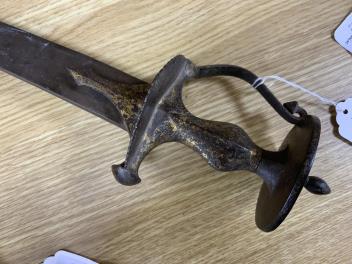 Lot 5 , An Indian sword tulwar c.1800 with broad curved single edged blade, iron hilt with traces of gilding and unusual side guard