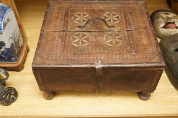 An Indian table top dowry chest with chip-carved and incised detail, 39cm wide