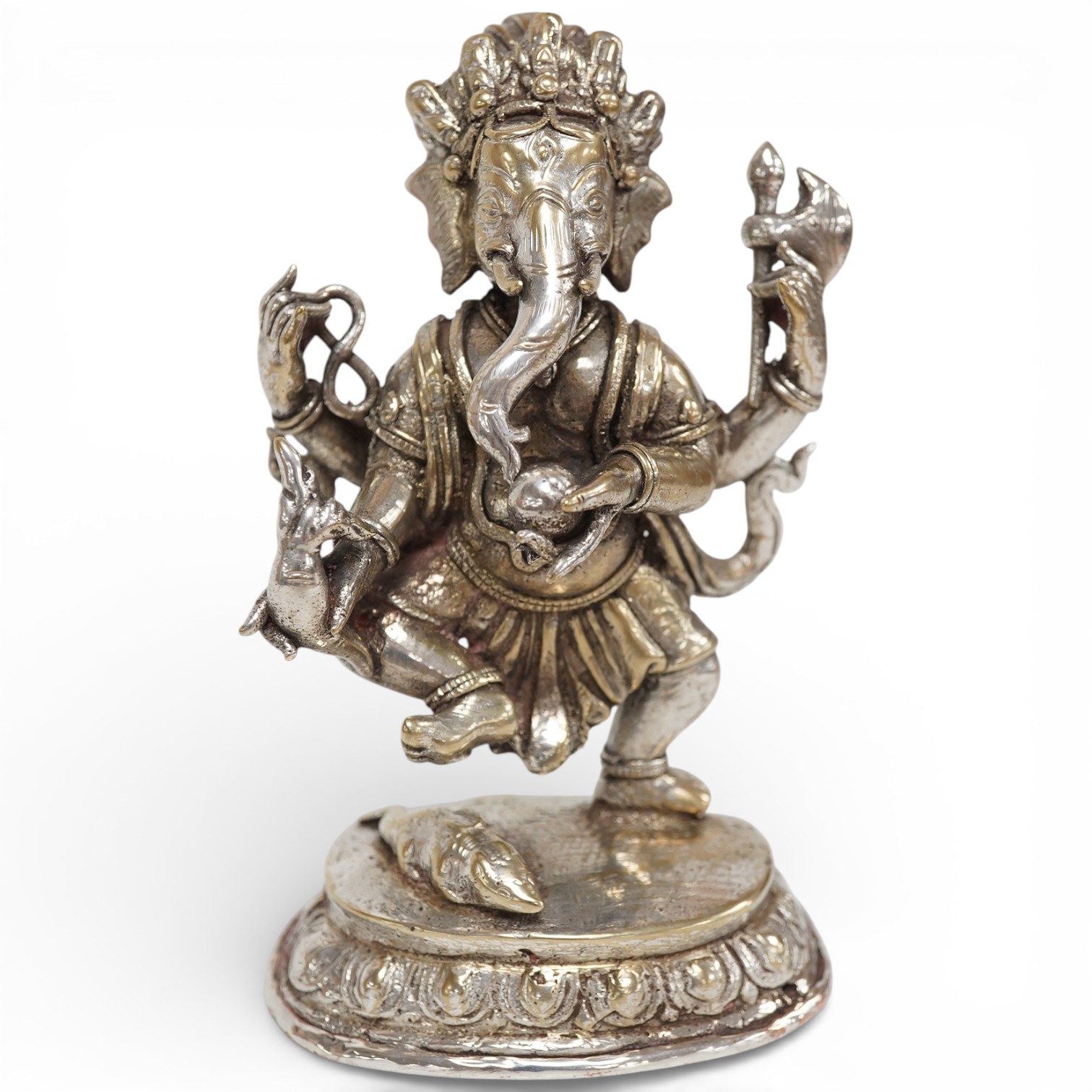 An Indian white metal mounted model of Ganesh, on a shaped oval base, height 12.8cm.