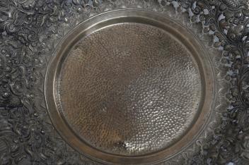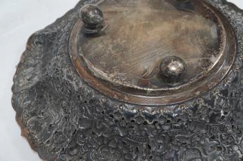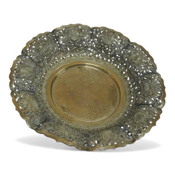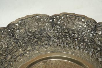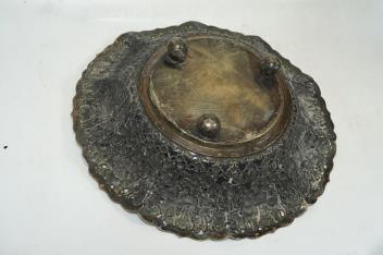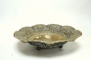 Lot 1844 , An Indonesian pierced white metal circular fruit bowl, decorated with floral motifs, on three ball feet, diameter 29.9cm.