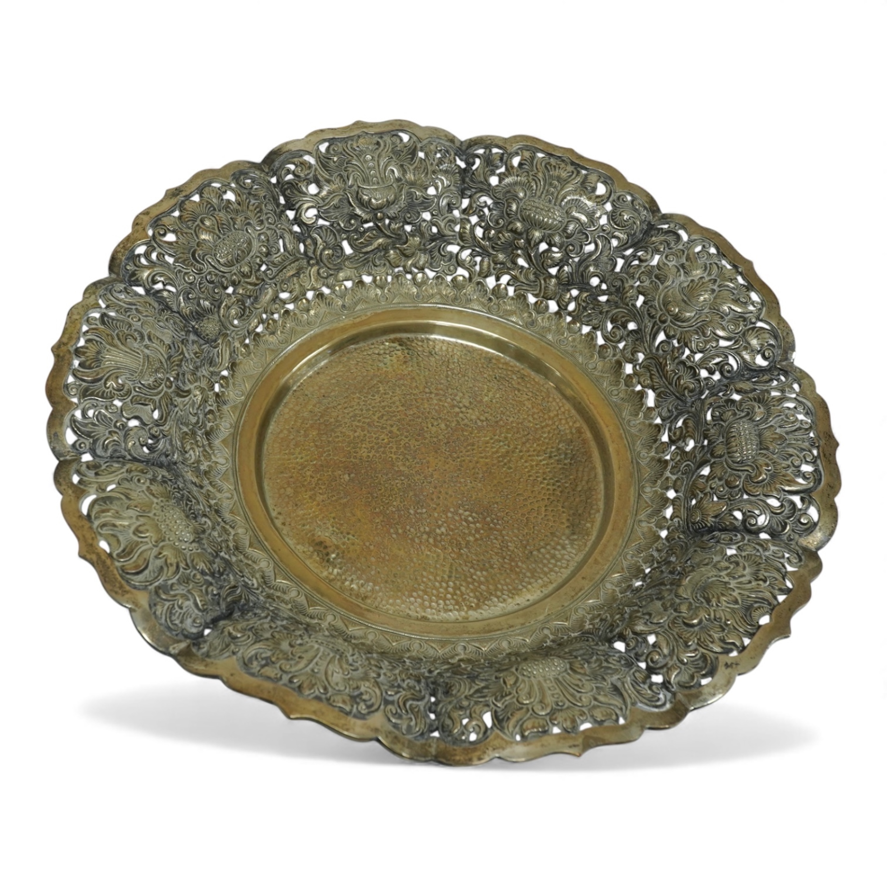 An Indonesian pierced white metal circular fruit bowl, decorated with floral motifs, on three ball feet, diameter 29.9cm.
