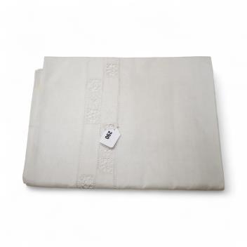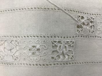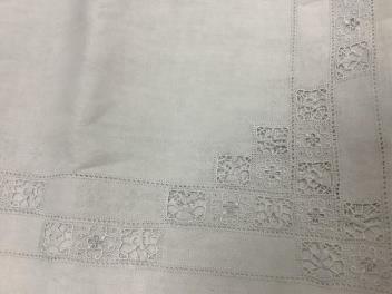 Lot 290 , An Italian large linen drawn thread worked and embroidered table cloth, with small square needle lace insertions, 275cm long x 180cm wide. Condition - has a rust line, which maybe removed with rust remover. The cloth is