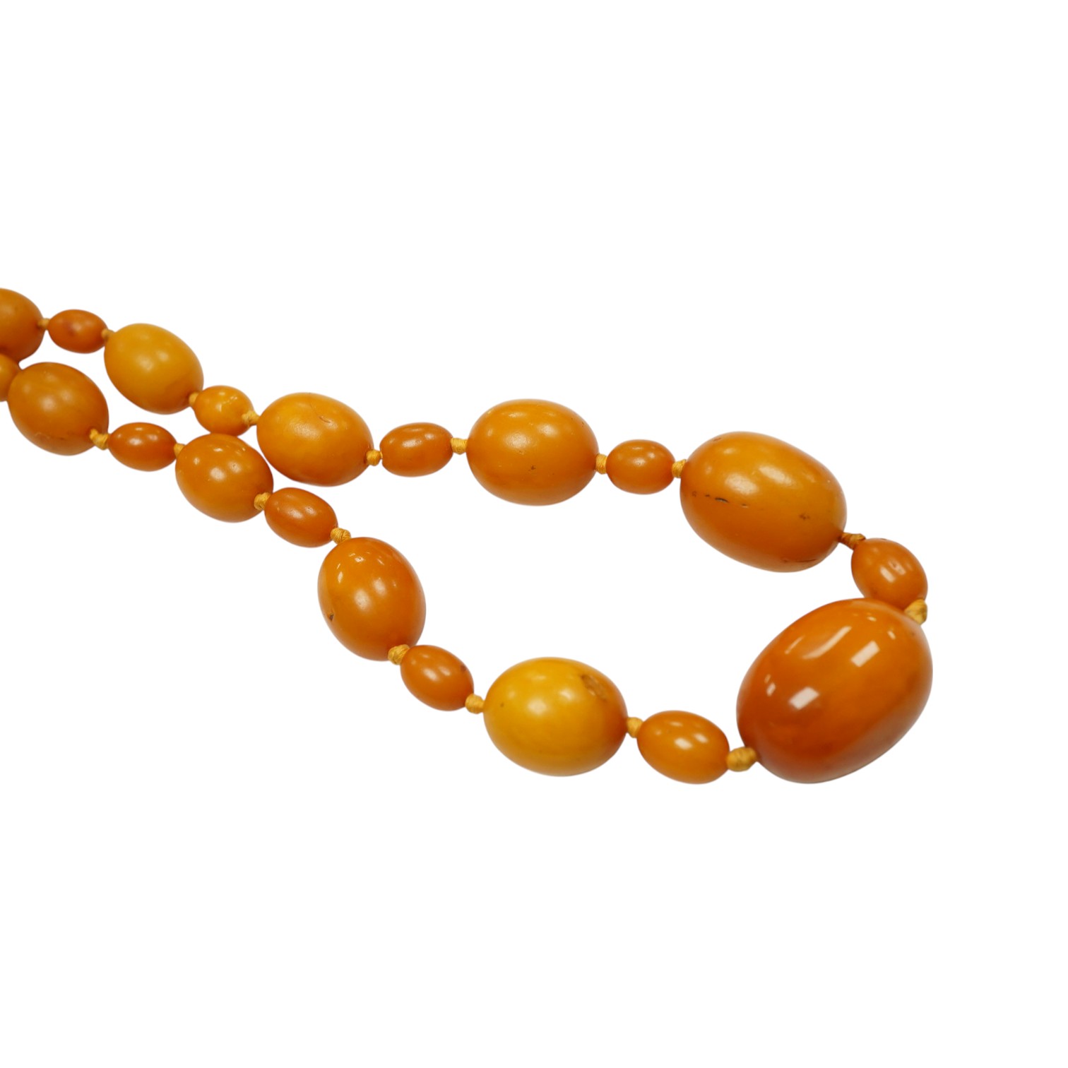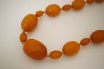 An amber necklace, composed of graduated oval beads measuring approximately 10-32mm, length 60cm, gross weight approximately 74 grams