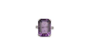 An amethyst and diamond ring, claw-set with a step-cut amethyst weighing approximately 11.00 carats, to shoulders set with circular-cut diamonds totalling approximately 0.30 carats, gross weight M1/2