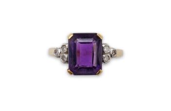 An amethyst and diamond ring, claw-set with a step-cut amethyst weighing approximately 2.50 carats, to shoulders set with trios of single-cut diamonds, mounted in bicoloured gold, size N, stamped 18CT, gross weight approximately 4 grams