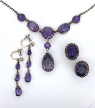 Lot 1942 , An amethyst necklace and two pairs of earrings, comprising: a Victorian necklace, the front composed of circular-cut and oval amethysts in pinched collet settings, suspending a pear-shaped amethyst pendant, to a plain go