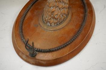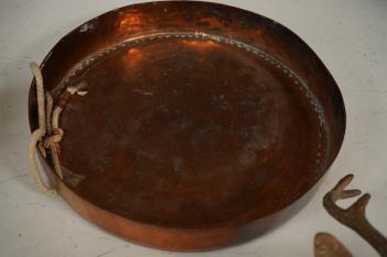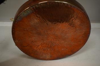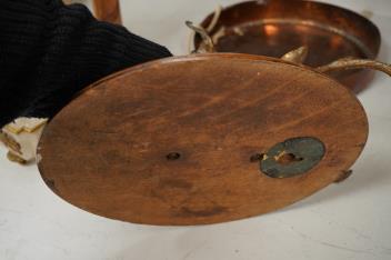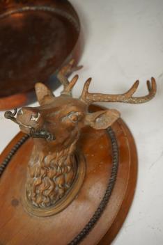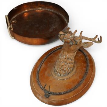 Lot 1123 , An antique copper shooting lodge dinner gong, together with a brass deer's head wall mount, largest 37cm high
