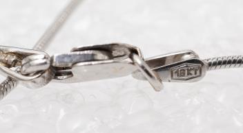 An aquamarine and diamond pendant, collet-set with a step-cut aquamarine weighing approximately 4.00 carats, within a border of brilliant-cut diamonds and a triangular-cut diamond bail, totalling approximately 0.70 carats, to a snake chain necklace, mounted in bicoloured gold, pendant length 2.2cm, chain length 40cm, chain stamped 750, gross weight 7.5 grams
