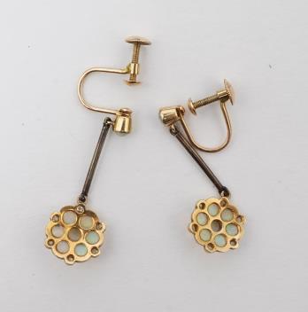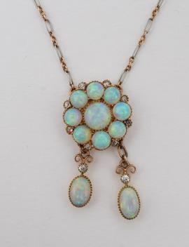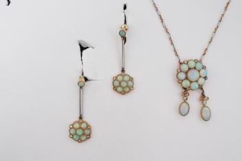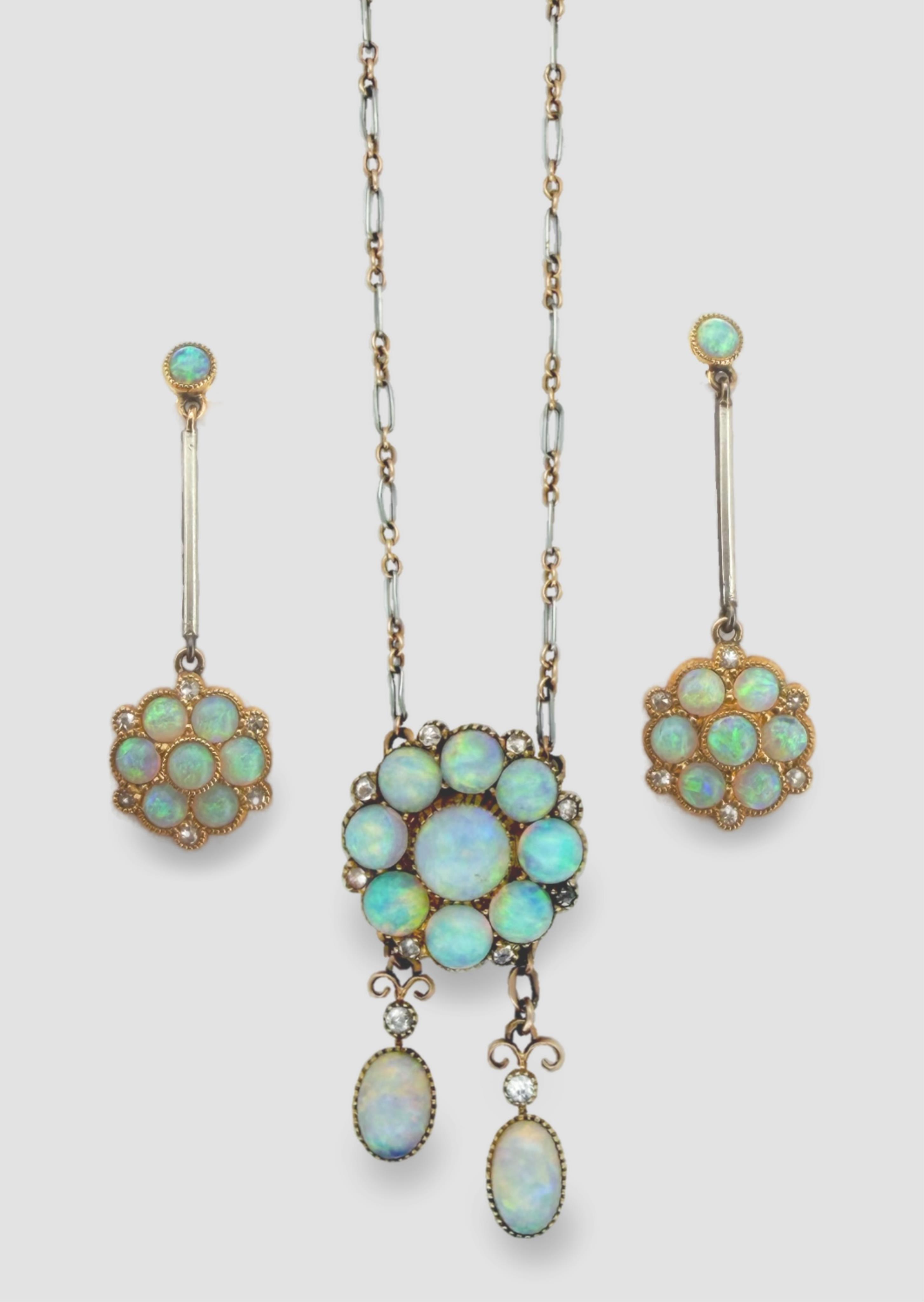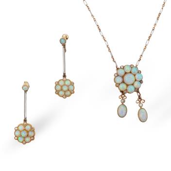 An attractive Edwardian opal and diamond demi-parure, early 20th century, comprising: a pendant of negligée design, composed of a floral cluster of opals suspending two opal pendants of asymmetrical length, accented by circular-cut diamonds, to a bicoloured chain, mounted in gold and platinum, pendant length 3.1cm, chain length 39cm; and a pair of drop earrings of similar design, length 3.3cm each, screw fittings