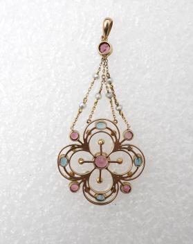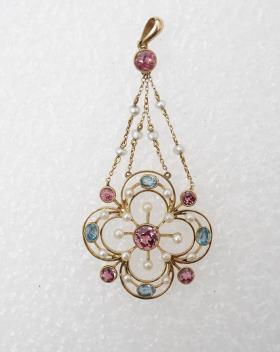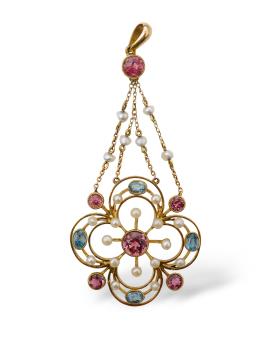 An attractive Edwardian tourmaline and seed pearl pendant, early 20th century, designed in the Renaissance Revival style, the openwork pendant of quatrefoil outline suspended from chains, set with circular-cut pink tourmalines, oval blue tourmalines and pearls, mounted in gold, length 6.4cm including bail, gross weight approximately 5.5 grams, pearls untested