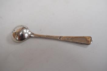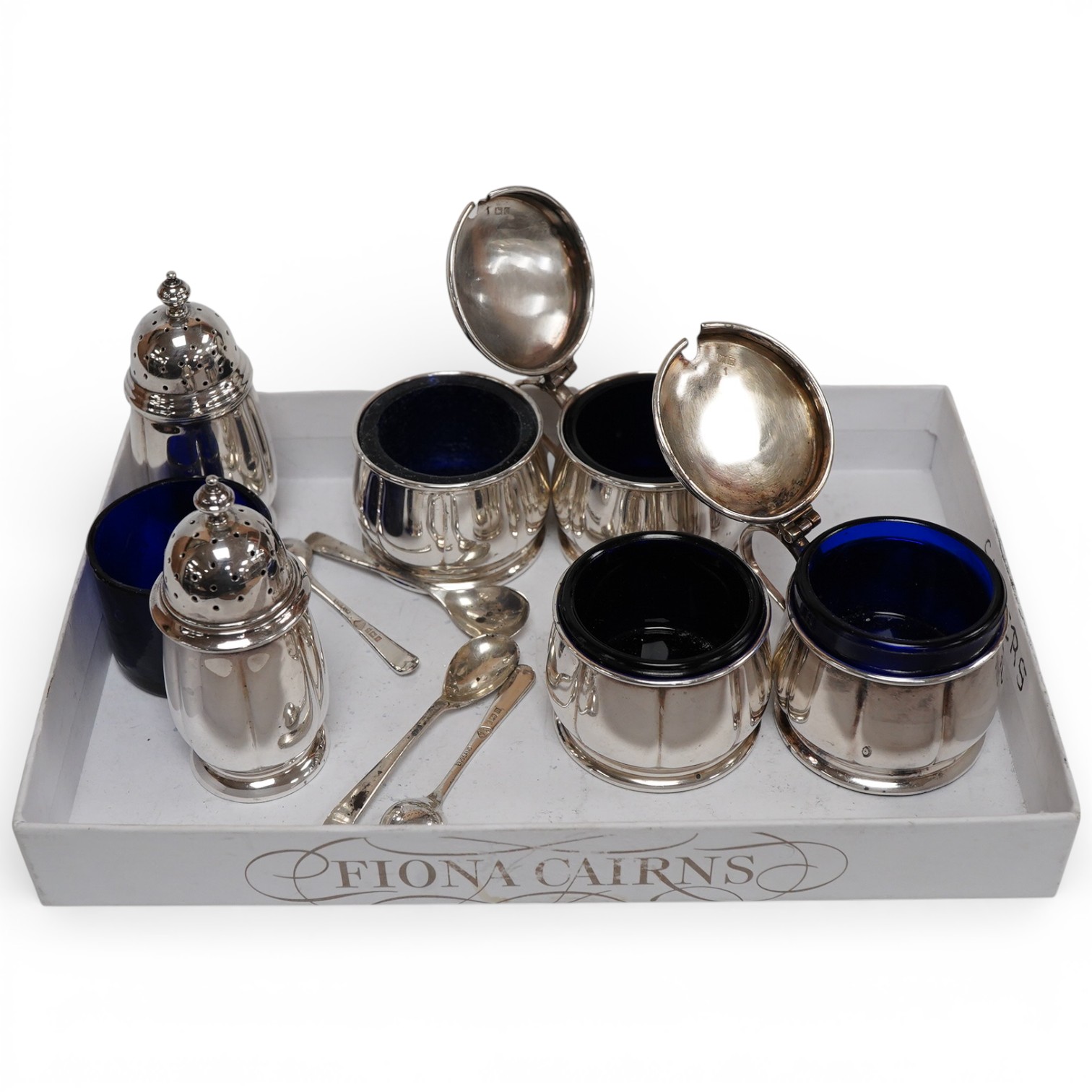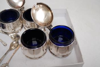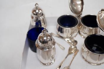 Lot 1835 , An early 1950's six piece silver condiment set, with four matching spoons and blue glass liners by Adie Brothers, Birmingham, 1951/2, with spare liner.