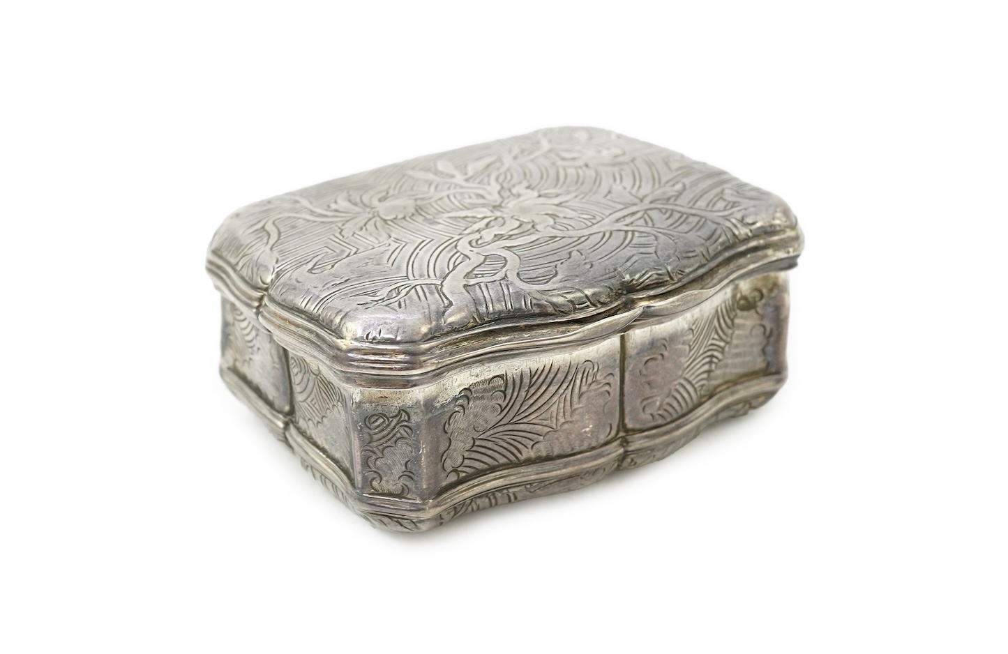 An early 19th century French white metal snuff box, with hinged cover, of shaped rectangular form and engraved with foliage on a geometric ground, 73mm, indistinct marks, 83 grams.