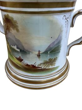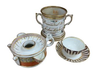 Lot 412 , An early 19th century decorative circular inkwell, a 1868 two handled presentation cup - 12.5cm high and a Worcester tea bowl and matching saucer