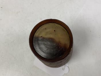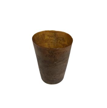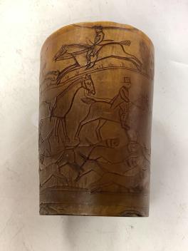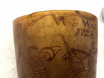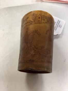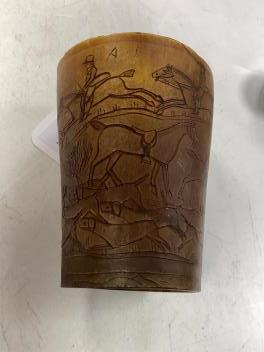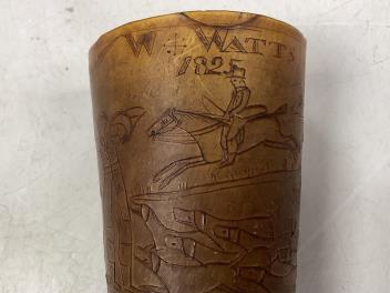 Lot 1260 , An early 19th century horn hunting beaker, engraved with a hunting scene, named W Watts, dated 1825, 8cm high