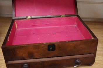 An early 19th century mahogany cased collection of mineral samples with old labels, comprising two removable trays and a drawer beneath, the case raised on bun feet, 30cm wide, 22cm deep, 14cm high