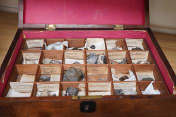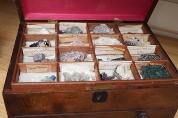 Lot 256 , An early 19th century mahogany cased collection of mineral samples with old labels, comprising two removable trays and a drawer beneath, the case raised on bun feet, 30cm wide, 22cm deep, 14cm high