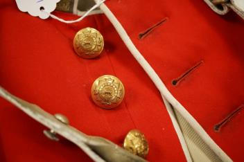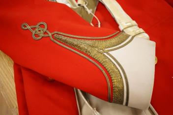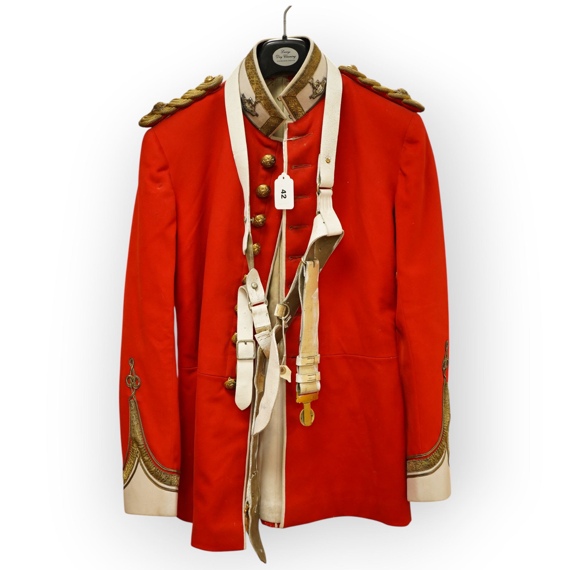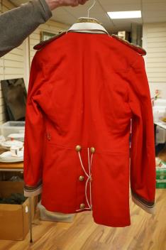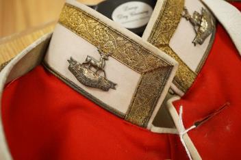 Lot 42 , An early 20th century Bedfordshire Regiment scarlet dress jacket, by Lieutenant J.G.M. Horsford who was killed in 1915, together with his sword belt and a copy of the entry in the battalion war diary