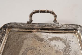 An early 20th century Chinese Export white metal two handled rectangular tea tray, by Luen Wo, Shanghai, with engraved presentation inscription, 'Presented to Captain John Whittle by the undersigned China Navigation  Cos. Chinese Pilots on his retirement from China, April, 1911', followed by a list of names, the central inscription surrounded by two engraved dragons, the border applied with four dragons and faux bamboo rim, with faux bamboo handles, on four faux bamboo leaf feet, width 58.7cm over handles, 83.2oz.