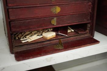 Images of the contents of each drawer (descending) shown in images 7 to 11. Bottom drawer in need of repair; all pieces bamboo-backed; the four pieces shown in bottom drawer are all blank.