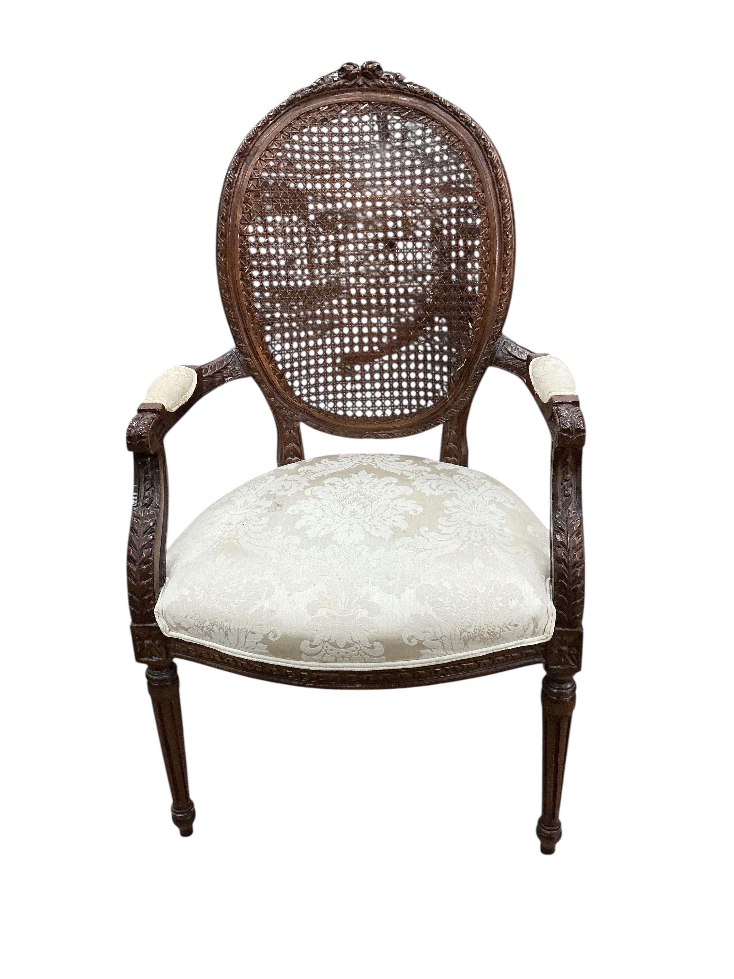 Lot 1025 , An early 20th century French carved caned mahogany elbow chair in Louis XVI style, width 61cm, depth 53cm, height 112cm