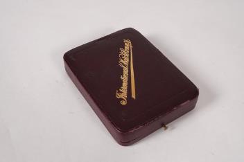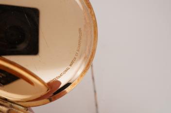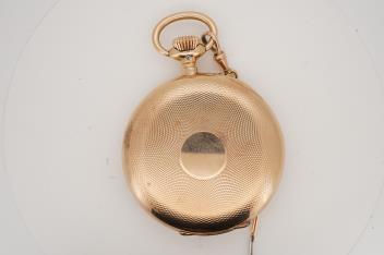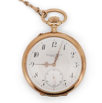 Lot 95 , An early 20th century International Watch Company engine turned 14k yellow metal open faced keyless lever pocket watch, together with a Viennese? two colour yellow metal albert, maker's mark, LE